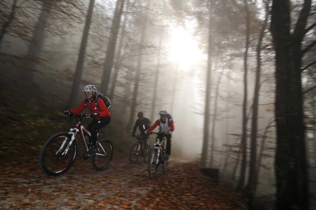Frühmorgens hüpfen wir mit Gänsehaut geschwind in alle verfügbaren Klamotten. Noch in der Dämmerung biken wir auf einem Singletrail durch ein Lärchenwäldchen rauf zum 1741 Meter hohen Feuerpalven. Auf der exponierten Aussichtskanzel schweben wir über einer dichten Nebelsuppe. Die komplette Welt scheint in Watte gepackt. Der Königssee direkt unter uns wirkt wie ein Schaumbad... bereit für den Hechtsprung. Die furchterregende Ostwand des Watzmanns wächst direkt daraus empor. Urplötzlich steckt der Peitschenknall der aufgehenden Sonne alles in Brand, wühlt die Nebelsuppe auf und lässt die kalte Wand erröten. Heureka, was für ein Schauspiel. Wer denkt da noch an die Strapazen des Vortags.