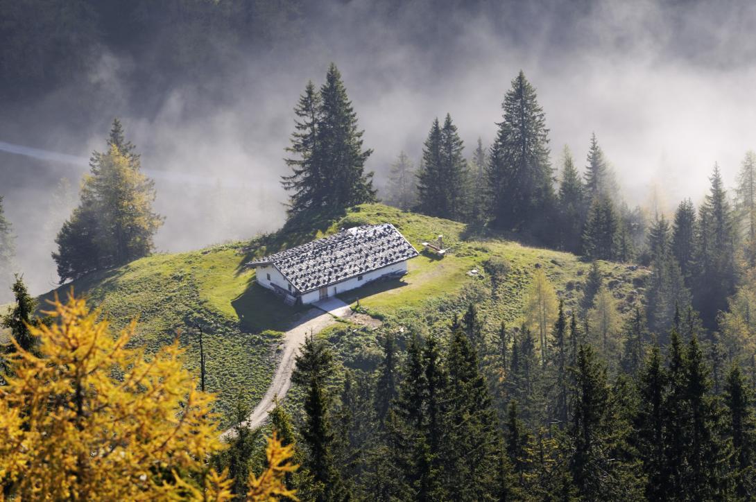 Wir starten am Südende des Hintersees in der malerischen Ramsau. Diese Route steigt gemach. Lässt uns genug Zeit den Kopf in den Nacken zu legen, um die spektakuläre Felsenarena zu studieren. Links schrauben sich der Hochkalter und die Hocheisspitze in den Himmel. Rechts dominieren die Mühlsturzhörner. Nomen est omen. Die Alpen heben sich jährlich um 3 mm, da ist Bewegung drin. Dadurch lösten sich im September 1999 sage und schreibe 250.000 Kubikmeter Fels von der Gipfelflanke des Kleinen Mühlsturzhornes. Das muss einen ordentlichen Rumms gegeben haben, wochenlang war die ganze Gegend eingestaubt, erfahren wir von der Infotafel. Wer auf der Hirschbichl-Straße kurz über die Stahlhängebrücke fährt, sieht noch heute die Abrissfläche. Die Tour bleibt technisch einfach, die Untergründe immer gut machbar. Gut so, denn das Ziel, die Litzlalm ist berühmt berüchtigt. Innen und außen urgemütlich und wie aus dem Alpinmuseum. Die Terrasse eröffnet ein umwerfendes Panorama. Kein Wunder also, dass sich Werbe- und Heimatfilmer hier die Klinke in die Hand geben. Auch ein paar Folgen der berühmten „Bergdoktor“-Serie wurden auf der Litzlalm bereits gedreht. Flankiert von Zirbenholz, Hirsch- und Gemsengeweihen schmeckt die Brotzeit besonders gut. Ein Schnapserl geht noch… am Ende cruisen wir erneut durch zähen Nebel, zurück zum Hintersee – wohlgemerkt mit der Stirnlampe auf dem Kopf, die das spukige Szenario erhellt.