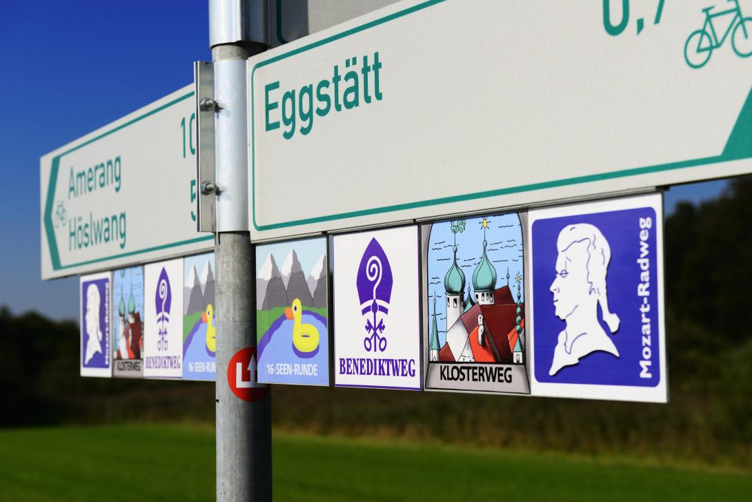 Urige Biergärten und zahllose Badestrände wollen uns sirenengleich vom Sattel zerren. Weißwürste mit Brez'n und ein Weißbier zum Frühschoppen, Obazda, Schweinshax'n mit Knödl locken die mit Kreide beschriebenen Werbetafeln der Wirtshäuser. Oder vielleicht nur ein Eisbecher und die Füße vom Steg in das Bayrische Meer baumeln lassen, sozusagen Dolcefarniente in Bella Bavaria. Schafwaschen, Gstadt, auf perfektem Asphalt rollen wir weiter nach Breitbrunn und Seebruck. An manchen Kreuzungen hängen bald 8 Radwegetafeln. Chiemgau-Radweg, Mozartweg, die Bayuwaren-Tour... der Chiemgau lässt sich auf vielen tollen Radrouten erobern. Wir bleiben erstmal auf dem "Benediktweg". Der Werdegang des Bayrischen Ex-Papstes ist stark mit seiner Region verwoben. So lag es nahe, einen Radweg, den am 11.08.2005 eingeweihten Benediktweg, ins Leben zu rufen. Er kombiniert über 248 kongeniale Kilometer lang, die inflationäre Anhäufung an Klöstern, Kirchen, Kapellen, profaner und sakraler Kunst mit der Schönheit der „Terra Benedicta“.