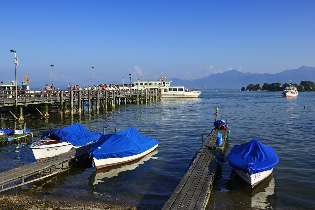 Ein wundervoller Pfad durch mehr als mannshohes Schilf leitet runter zur Uferpromenade. Auf der Herreninsel leuchtet das bayerische Versailles, das prächtige Schloss Herrenchiemsee, das der Schöngeist König Ludwig II hier 1878 errichten ließ. Dahinter strahlen die frisch angezuckerten Gipfel der Chiemgauer Alpen wie die frisch gebleachten Zähne von Hollywood-Diven.