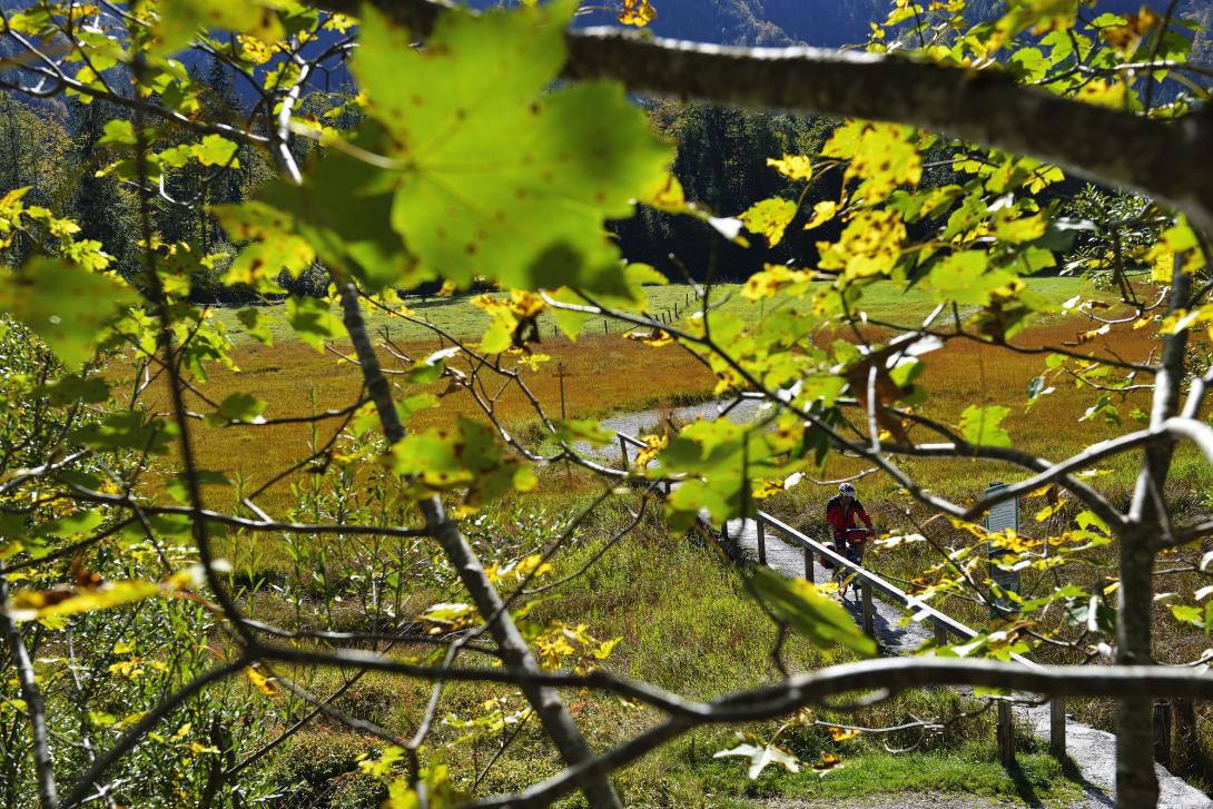 Weiter geht’s: Der Radweg bleibt ein Gedicht und führt zum berühmten Reit im Winkl. Seit Rosi Mittermaier von der nahen Winklmoosalm 1976 bei der Olympiade in Innsbruck jede Menge Edelmetall abräumte, gilt Reit als stehender Begriff im Wintersport. Wir verlassen die urbayerischen Gefilde für eine kleine Stippvisite in Tirol. Über Kössen und etliche zusätzliche Höhenmeter gelangen wir zurück in den Chiemgau zu den markanten Felswänden des Klobenstein. Der Radweg folgt dem Tiroler Achen, schlängelt sich weiter zu den herbstlich gewandeten Gipfeln des Geigelsteins und der Hochplatte. Auf dem Salinenweg queren wir nordwestlich nach Bernau, dem Tor zum Bayerischen Meer - dem Chiemsee.