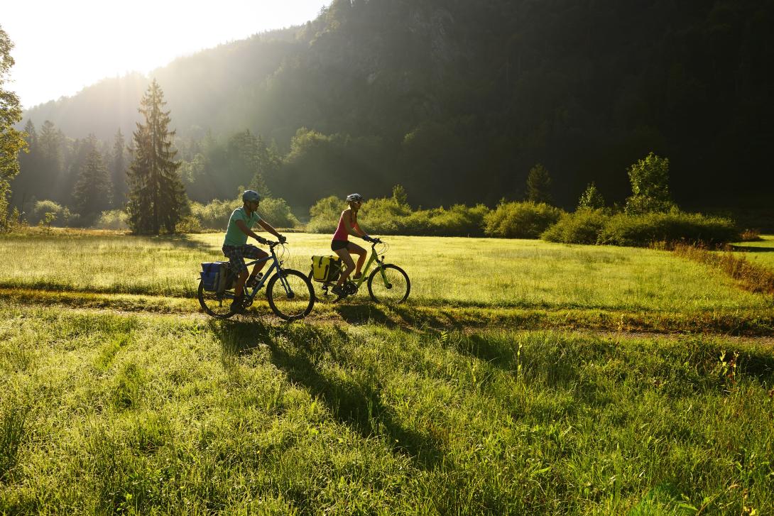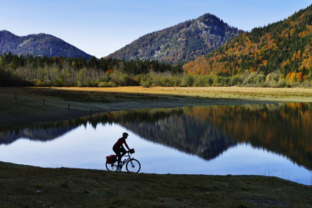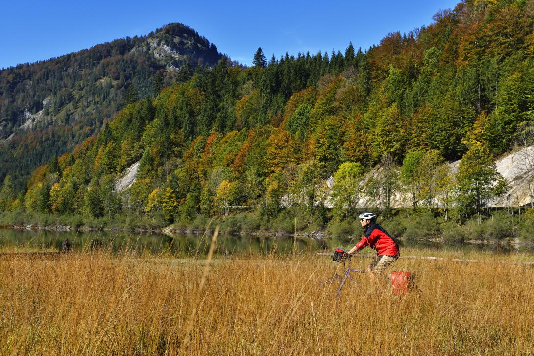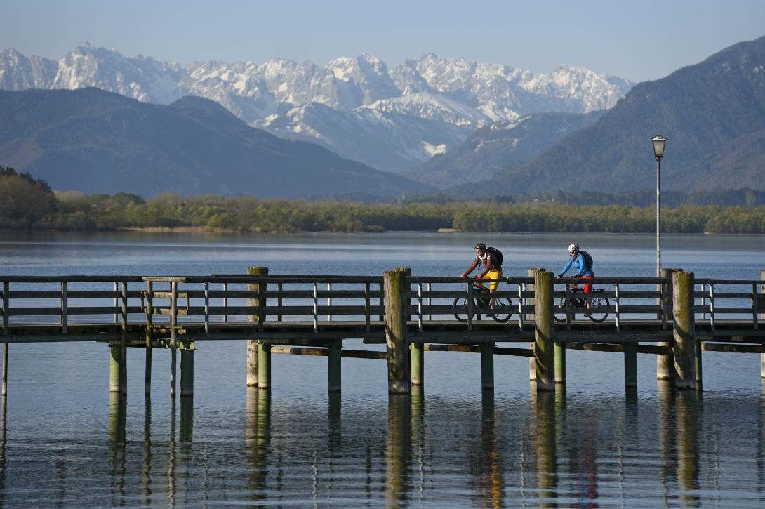 Weiter geht’s: Der Radweg bleibt ein Gedicht und führt zum berühmten Reit im Winkl. Seit Rosi Mittermaier von der nahen Winklmoosalm 1976 bei der Olympiade in Innsbruck jede Menge Edelmetall abräumte, gilt Reit als stehender Begriff im Wintersport. Wir verlassen die urbayerischen Gefilde für eine kleine Stippvisite in Tirol. Über Kössen und etliche zusätzliche Höhenmeter gelangen wir zurück in den Chiemgau zu den markanten Felswänden des Klobenstein. Der Radweg folgt dem Tiroler Achen, schlängelt sich weiter zu den herbstlich gewandeten Gipfeln des Geigelsteins und der Hochplatte. Auf dem Salinenweg queren wir nordwestlich nach Bernau, dem Tor zum Bayerischen Meer - dem Chiemsee.