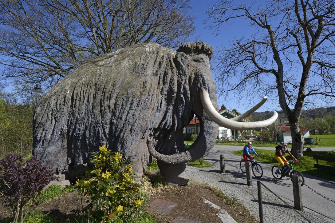 Aber alles der Reihe nach. Der Startschuss für unsere dreitägige Chiemgau-Runde ertönte in Traunstein. Schon die ersten Radumdrehungen führten uns in ein Bermudadreieck aus Wohlgerüchen. Unter den Arkaden des Stadttors duftete es nach frisch gebrühten Würsten, die Stände des Wochenmarkts schichteten Schinken und Käse turmhoch auf. Die Herbstsonne kletterte über die Kirchturmspitze von Sankt Oswald. Sofort war klar, nichts wie weg. Sonst würden wir die gut 238 Kilometer unser großen Chiemgau-Herbst-Runde niemals in drei Tagen schaffen. Unter lichtdurchfluteten Weiden strampelten wir am Ufer der Traun bis nach Siegsdorf und trafen unvermittelt auf ein lebensgroß nachgebautes Mammut. 1975 wurden dort 45000 Jahre alte Mammutknochen gefunden. Seit 1995 offenbart das kleine, aber feine Museum nun allerlei Wissenswertes über die Steinzeit im Chiemgau.