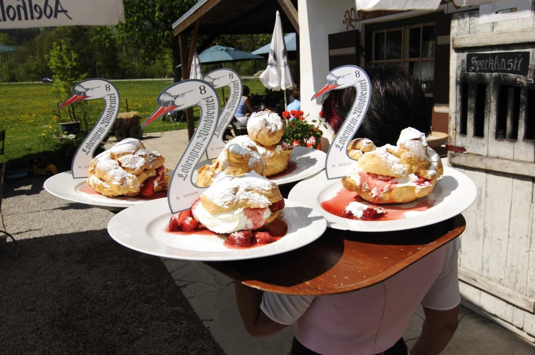 Schon wenig später in Ruhpolding, dem Mekka der Biathleten, war es um unsere Moral geschehen. "Extra bavariam non est vita et si est vita non est ita", lautet das Motto der Ruhpoldinger "Windbeutel-Gräfin". Frei aus dem Lateinischen übersetzt will diese Holztafel über dem prächtig herausgeputzten Gasthof ganz bescheiden klarmachen: Außerhalb Bayerns gibt es kein Leben und wenn doch, dann nicht dieses. Und wie zum Beweis, kam die Kellnerin mit ihrem hübschen Dirndl schwungvoll ums Eck. Nicht nur der XXL-Windbeutel mit Sauerkirschen und Vanilleeis war eine Augenweide. Direkt dahinter stiegen auch noch die Bergzacken der Chiemgauer Alpen in die Höhe. Tja, an Tagen wie diesen gibt es nicht den geringsten Zweifel an dieser lateinischen These.