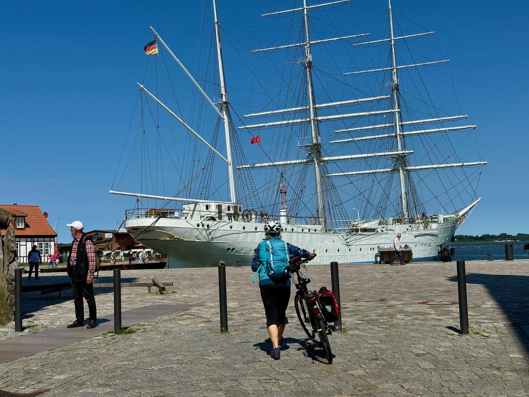 Weitere Tagestouren von Stralsund führen etwa zur Boddenküste und nach Fischland-Darß-Zingst. Vor allem Hobby-Ornithologen dürften sich begeistern für einen Ausflug nach Barhöft. Der winzige Ort am Eingang zum Nationalpark Vorpommersche Boddenlandschaft war früher Stützpunkt der Nationalen Volksarmee der DDR. Heute trifft man dort vor allem Segler und Naturliebhaber. Die 13 km lange Radstrecke nach Barhöft zieht sich überwiegend verkehrsfrei, meist am Meer entlang. Alles quasi ohne Steigungen, nur ab und zu mit kräftigem Gegenwind. Im Nationalpark verjüngt sich der Weg kurzzeitig sogar mal zum Wiesenpfad. Kein Problem! Dabei sollte aber kein Fahrradfan den Aufstieg auf den Backsteinturm vergessen. Lohn fürs Treppensteigen ist der Ausblick auf die Halbinsel Zingst, die Inseln Bock, Hiddensee und Rügen sowie zurück bis Stralsund. Und natürlich auf die vielen Vögel und die üppig grüne Natur. Der Kiosk und Krämerladen „Proviantkiste“ am kleinen Hafen von Barhöft bietet danach alles für Radler und Seeleute, vom Angelhaken bis zur Zahnpasta, vom Cappuccino bis zum Matjesbrötchen. Und dabei lässt es sich bequem in der Sonne sitzen und auf die Jollen kieken.