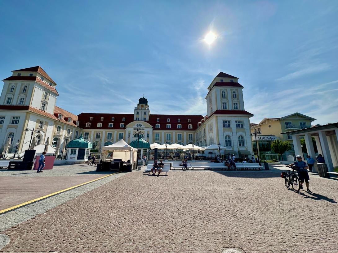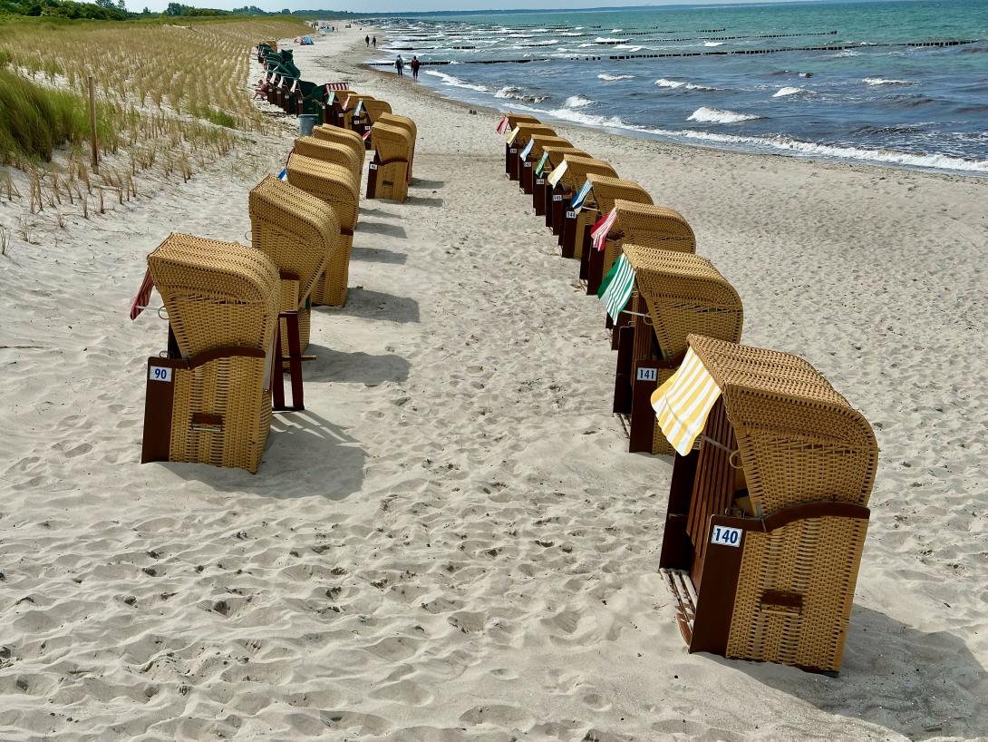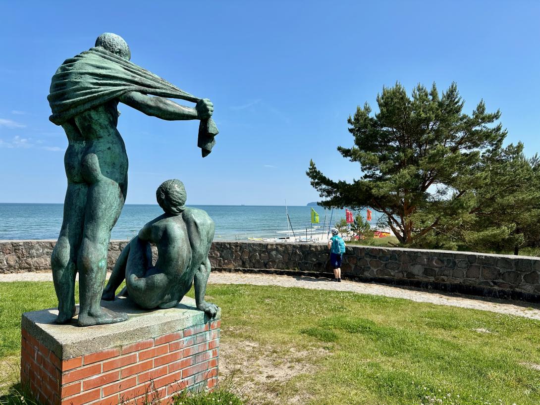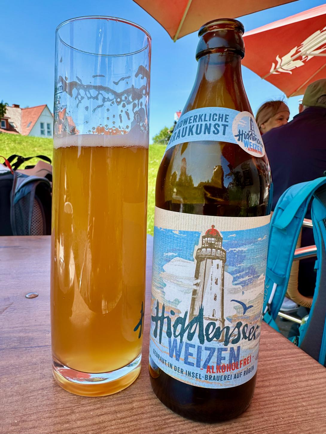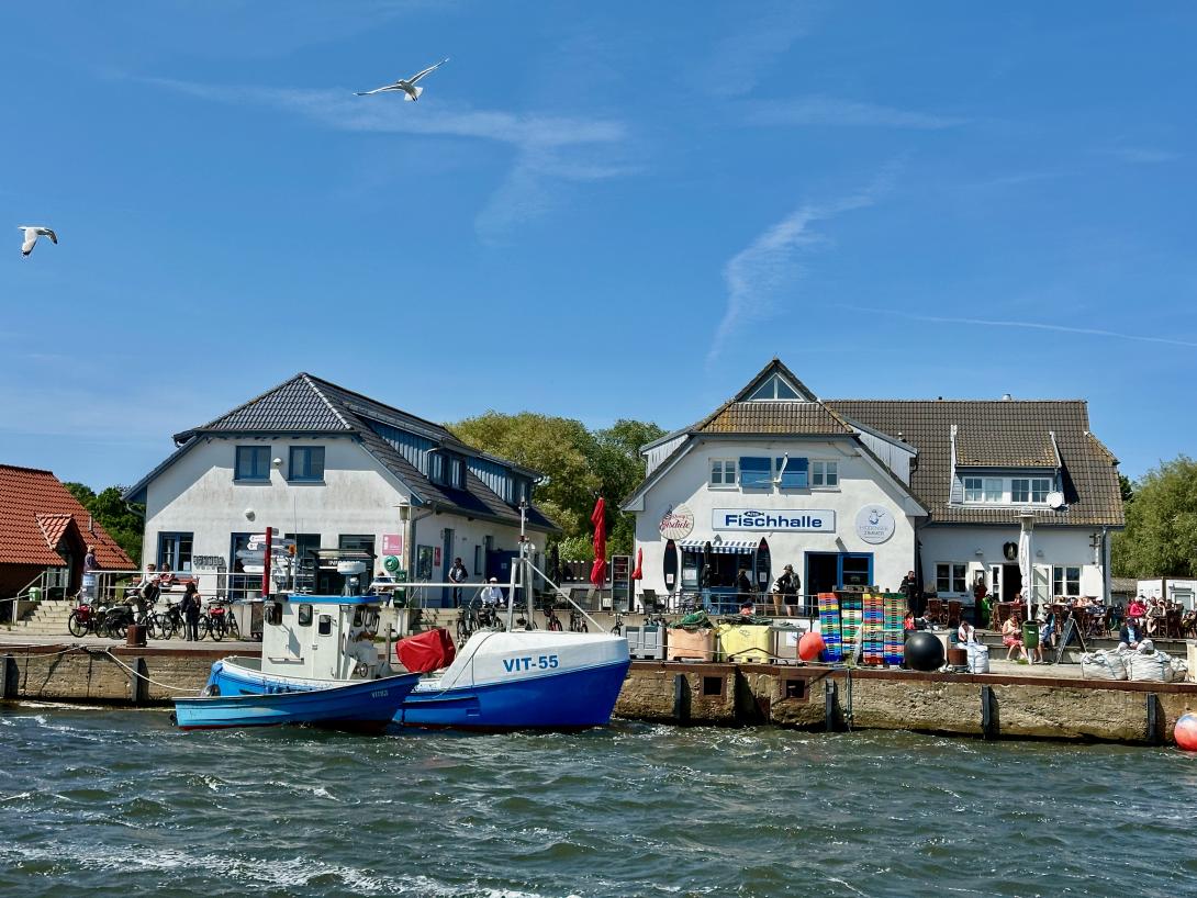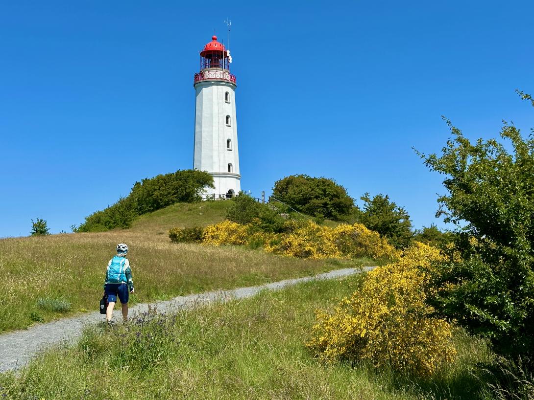 Etwas belebter zeigt sich meist auch die Insel Hiddensee. Das schmale, 17 km lange Eiland im Westen, im vergangenen Jahrhundert Rückzugsort vieler Künstler und Literaten, wie Erich Heckel und Gerhard Hauptmann, verlangt trotzdem nach einem Besuch. Also morgens vom Radlerhotel schnell zum Fährhafen, mitsamt dem Rad aufs Schiff und sich erstmal 1,5 bis 2 Stunden Seeluft um die Nase wehen lassen. Aber die Fähre nicht verpassen! Ab Stralsund verkehrt sie nur einmal am Tag. Unser Tipp: Mit dem Rad im Inselsüden in Neuendorf aussteigen und im Norden in Kloster am Nachmittag wieder an Bord gehen. Dazwischen radelt man durch liebliche Dünen- und Heidelandschaft. Hinter dem Damm lockt ein ausgedehnter Sandstrand. Genauso attraktiv sind für Radler die schnuckeligen Cafés und die Kioske mit den obligatorischen Fischbrötchen – und dazu vielleicht ein alkoholfreies Hiddensee-Weizen. Hier denken sicher sich wohl so manche, dass man hier auch mal ein paar geruhsame Ferientage in einem Reetdachhäuschen verbringen sollte. Im Norden der Insel bleibt das Rad dann mal eine Weile stehen. Denn hinauf zum Leuchtturm „Dornbusch“ und Insel-Ausblick ist es nicht nur ordentlich steil, sondern es gilt auch ein Fahrradverbot. Aber die Bergtour lohnt sich, allein wegen des 360-Grad-Rundblicks auf Ostsee, Rügen und Hiddensee.