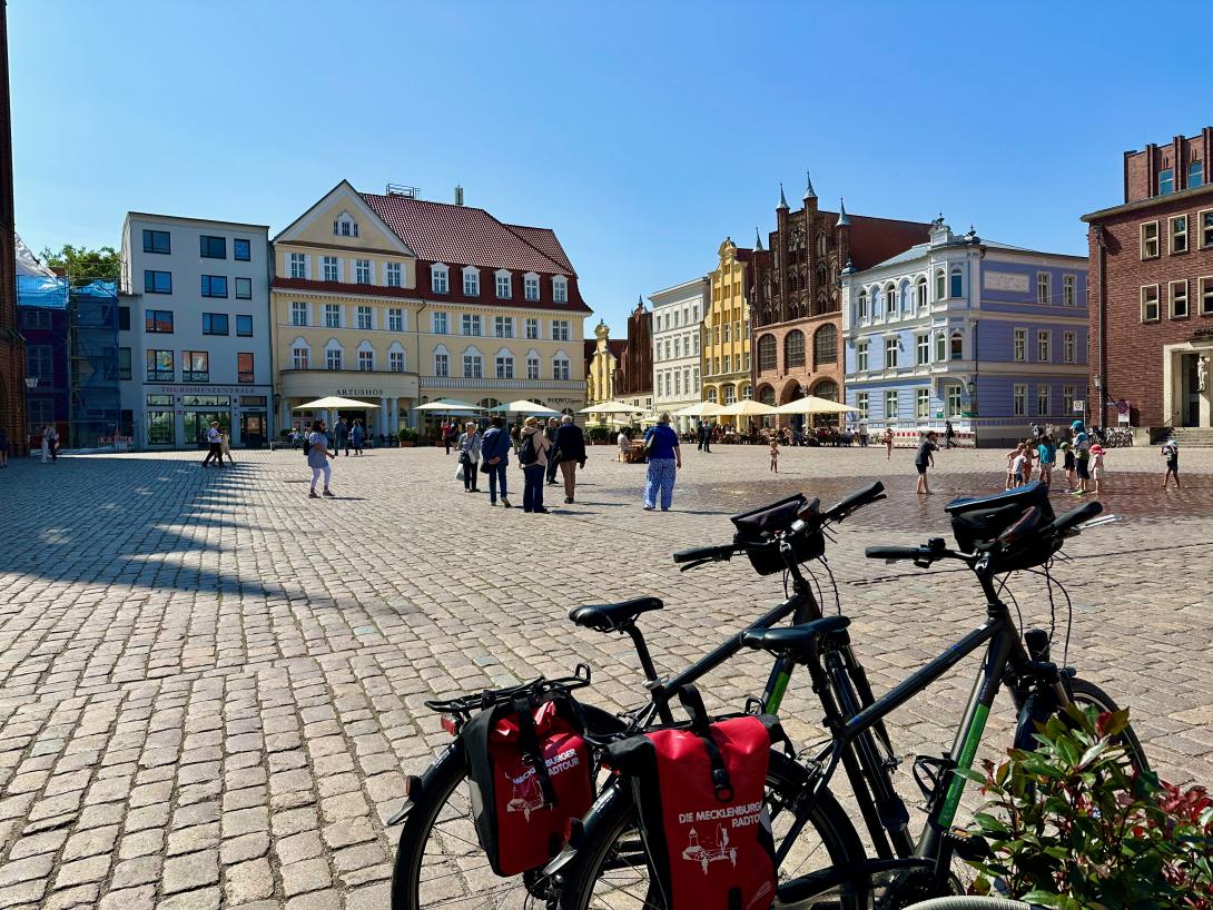Und wo trifft man sich in Stralsund? Gerne in einem Café am Alten Markt, dem großen, autofreien Platz vor dem historischen Rathaus. Das markante Gebäude im Stil der norddeutschen Backsteingotik zählt übrigens zum Kernbereich der von der UNESCO als Weltkulturerbe ausgezeichneten Historischen Altstädte Stralsund und Wismar. Das bedeutet ein Ambiente, (fast) wie aus einem alten Kostümfilm, alles überragt von der Pfarrkirche St. Nikolai. Fleischer, Bäcker oder Fischer haben heute keine Stände mehr auf dem Alten Markt. Dafür stehen rundherum Tische und Stühle von Gasthäusern und netten Cafés. An der Fontaine planschen kleine Kinder, während ihre Mütter nebenan im La Mer einen Latte Macchiato trinken. Hier kann man also gut nach einem kleinen Koffein-Schub seine Radeltour in die Vorpommersche Umgebung starten.