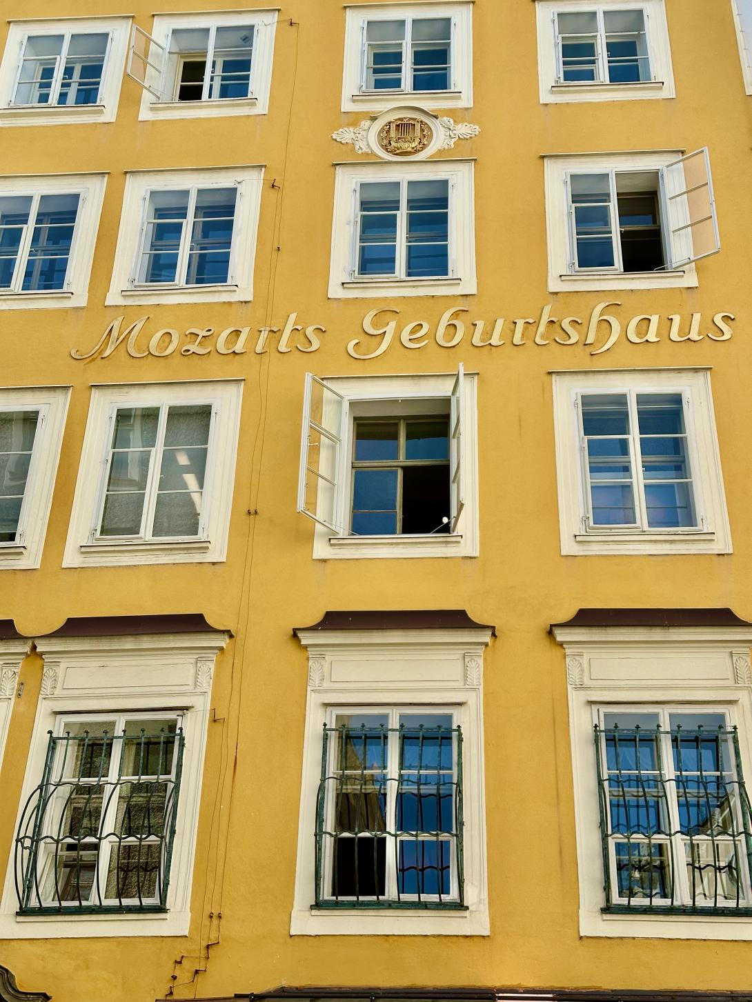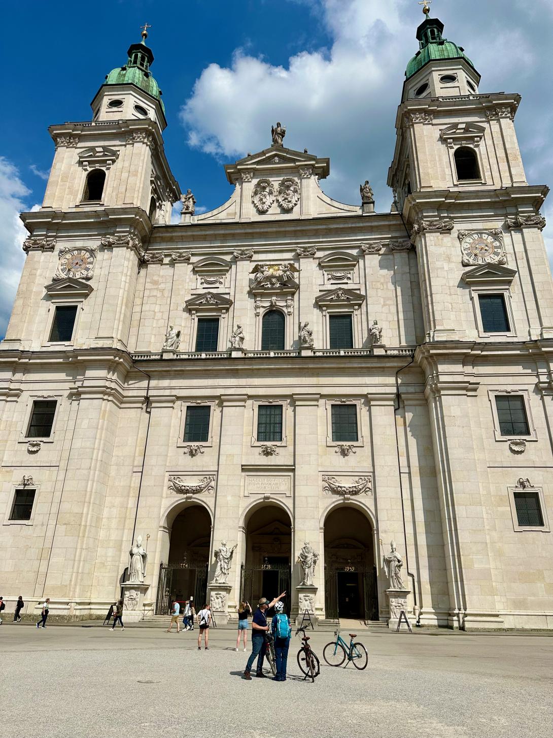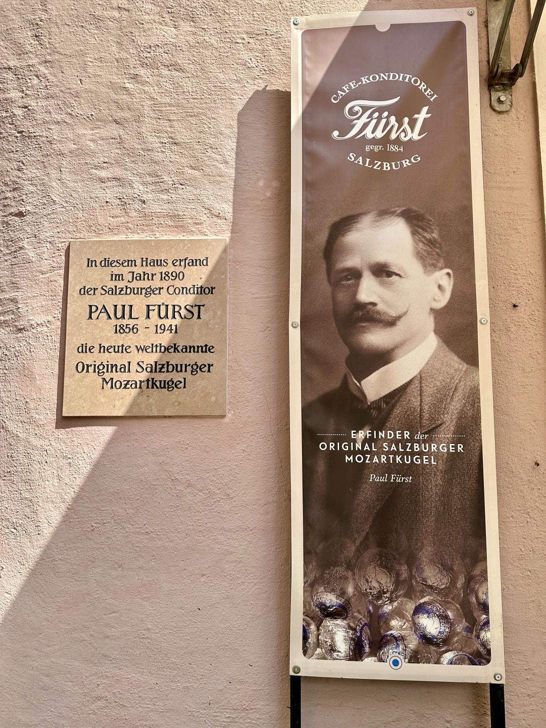 Nächster Halt unseres Radl-Sightseeing ist am Residenzplatz vor dem barocken Brunnen, dem größten und bedeutendsten der Stadt. Vor der Außenmauer des Doms parken die Fiaker und warten auf zahlende Gäste für eine kleine Kutschpartie. Auch hier im Domquartier fallen die vielen Radler auf, die aus der Altstadt kommen. „Ein Radelverbot gilt in der Innenstadt nur in der Getreidegasse und auf dem Mozartsteg,“ klärt uns Christian auf. „Aber vor Mozarts Geburtshaus an der Getreidegasse Nr. 9 gibt es mit dem Fahrrad eh kein Durchkommen in den Fußgängermassen. Zur Festspielzeit fahren wohl einige Besucher sogar mit dem Fahrrad zur „Jedermann“-Aufführung. Etwas mehr Platz für Radler und Fußgänger gibt es vor dem Café und Kiosk Tomaselli, dem ältesten Kaffeehaus Österreichs, gegründet im Jahr 1700. Wolfgang Amadeus Mozart soll dort gerne seine geliebte Mandelmilch getrunken haben. Schräg gegenüber befindet sich das Café Fürst, wo der Konditor Paul Fürst im Jahr 1890 die Original Mozartkugel erfunden hat – diese berühmte Praline aus Nougat, Pistazien und Marzipan. Ursprünglich hieß die Mozart-Kugel wohl auch Mozart-Bonbon. „Heute gibt es mindestens zehn verschiedene Mozartkugeln, aber die originale und beste ist immer noch die Kugel von Fürst,“ meint Christian. Als Snack zwischendurch gönnen wir uns jedoch eine salzige Salzburger Brezel vom Standl am Grünmarkt, der unter der Woche stets im Schatten der Universitätskirche stattfindet.