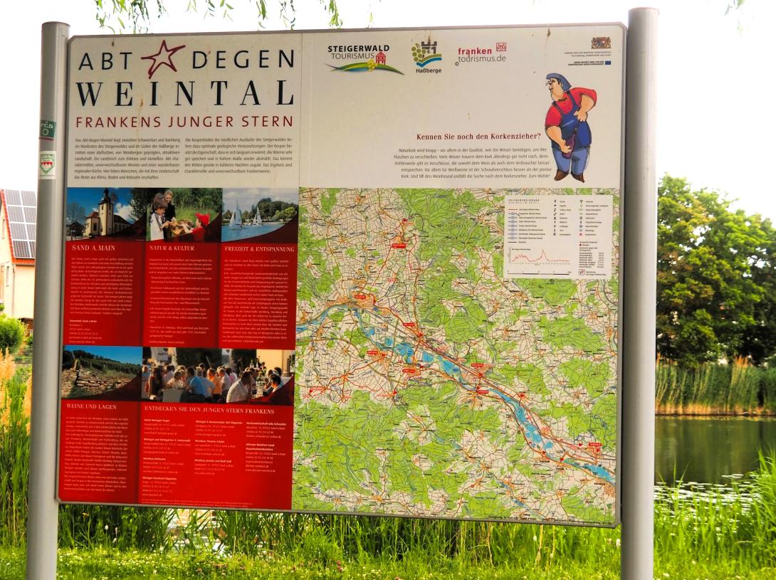 Zwischen Ziegelanger und Steinbach findet man den „terroir f Punkt Abt-Degen-Weintal“. Er liegt unmittelbar am Abt-Degen-Steig, zwischen Ziegelanger bei Zeil am Main und Steinbach in der Gemeinde Ebelsbach, und lädt auch die Radfahrer dazu ein, eine Pause einzulegen und die Umgebung zu genießen. Vom Radweg führt eine Abzweigung zum „terroir f“. Aktuell ist dies noch nicht beschildert, eine Skizze dafür finden Sie in der Bildgalerie.