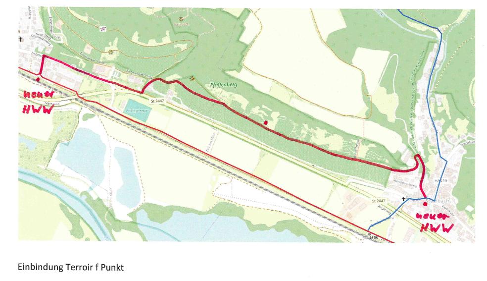 Wie finde ich den „terroir f“ Punkt Abt-Degen-Weintal? Aktuell ist der Abstecher vom Radweg zum „terroir f" Aussichtspunkt noch nicht ausgeschildert. In der Bildgalerie finden Sie eine Skizze mit der Sie zwischen Steinbach und Ziegelanger zum „terroir f“ finden. Das Tiefbauamt des Landkreises wird die eingezeichnete Verbindung im Frühjahr 2026 als offiziellen Radweg beschildern.