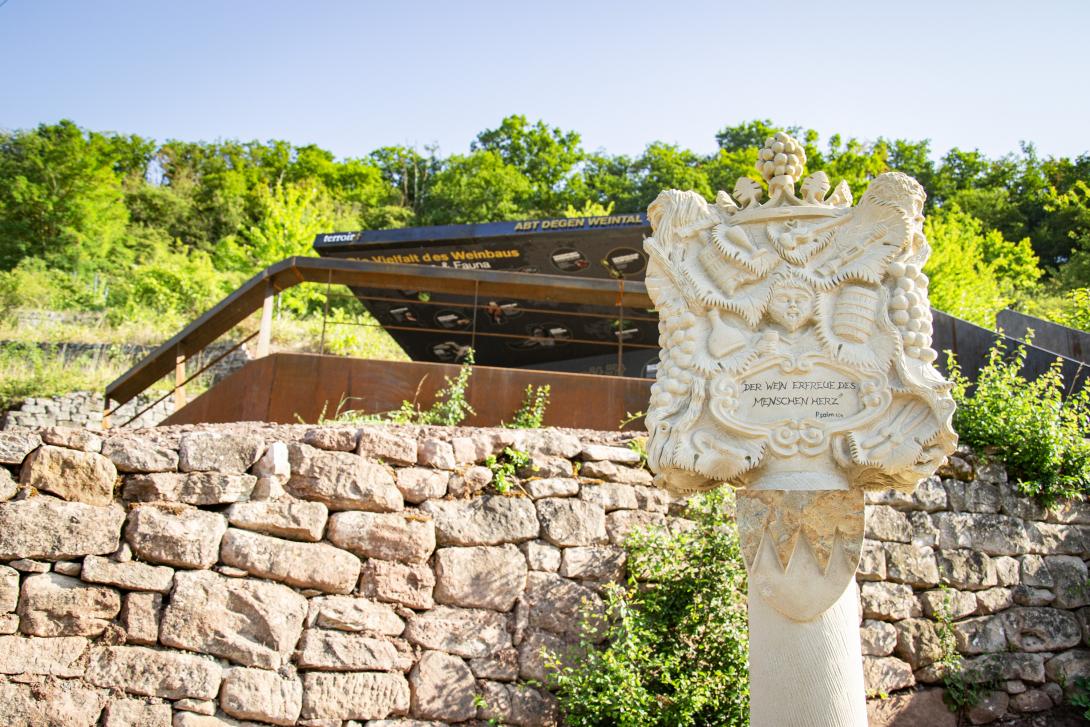 Eingebettet zwischen historischen Winzertreppen und traditionellen Trockenmauern lädt der 22. und zugleich jüngste "terroir f" Aussichtspunkt nahe dem Abt-Degen-Weintal-Radweg (Tourinfos finden Sie hier) zum Verweilen ein.