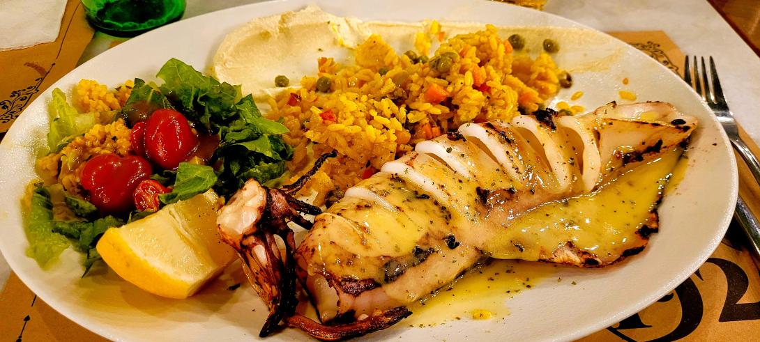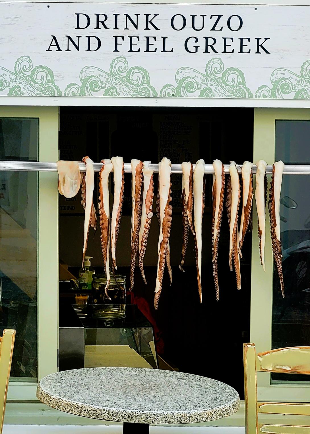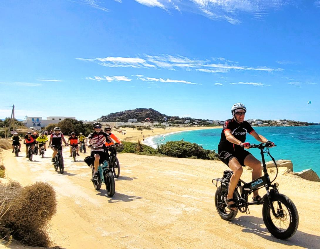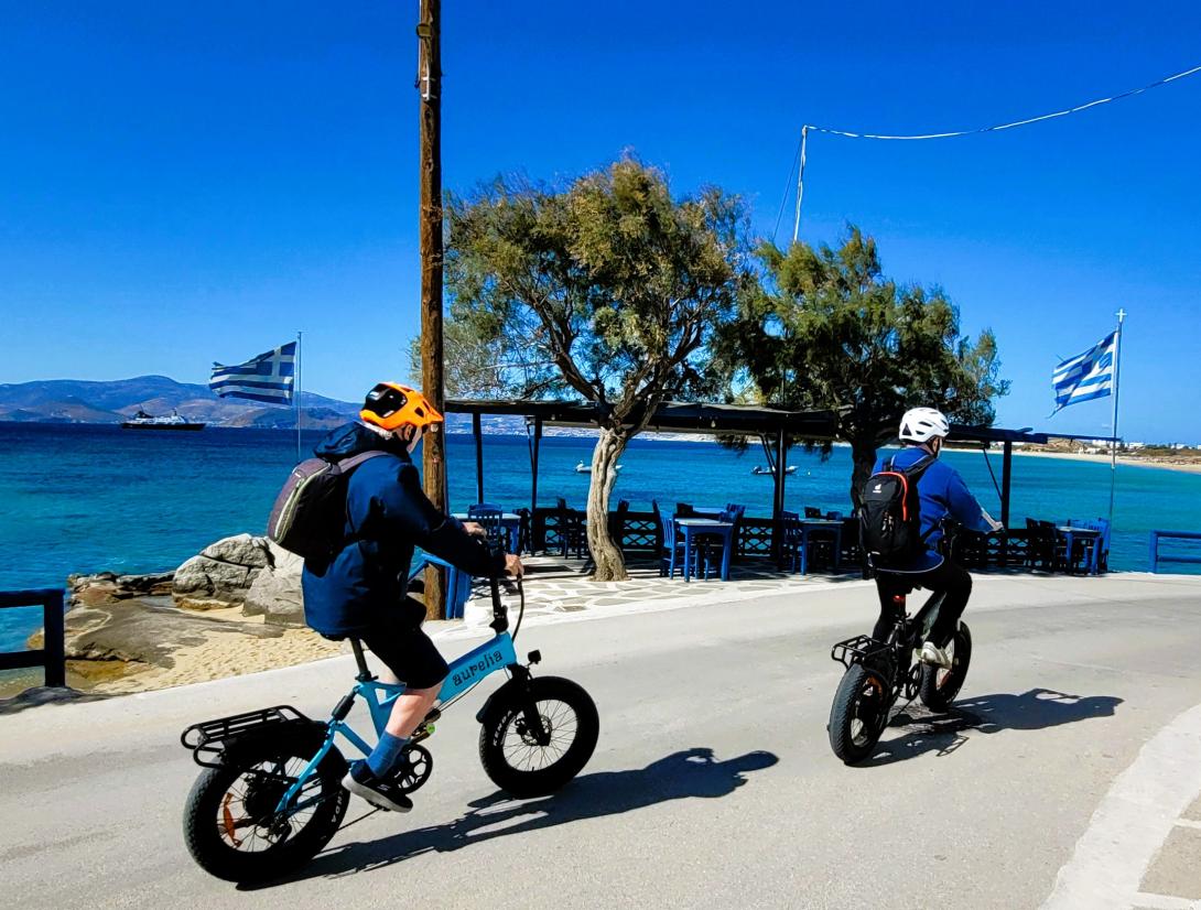 Etwa durch die Panoramafahrt entlang der Westküste, von den Graffiti-Ruinen auf den Felsen von Alykos weit im Süden bis hinauf zu den sanften Gestaden von Prokopios im äußersten Westen. Während wir in Alykos allein durch die geisterhaften Überreste eines geplanten Hotelbaus streifen und über die wandhohen Graffiti von Künstlern aus aller Welt staunen und rätseln, rauscht die Ägäis mit dem Wind um die Wette, Zikaden zirpen in der Mittagshitze, ein Milan kreist hoch über der Zedern-Macchia. Kleine Buchten verlocken zum Baden, auch in der Hochsaison ist hier wenig los. Auf der Küstenstraße knirscht der Flugsand unter unseren Fatbikes, wir sind froh über den eingebauten Rückenwind. Am Strand von Mikri Viglia steigen wir aus dem Sattel: hier bläst der Wind derart stark, daß sich zahlreiche Kite-Surfer in und über der Gischt wie Artisten produzieren können. Gemächlich rollen wir weiter, über Plaka und Maragas , immer am Meer, direkt hinter den kleinen Dünen. In Maragas wird Mittagspause gemacht, die „Taverna Paradiso“ ist seit 45 Jahren in Familienbesitz, ihre Tische stehen zum Teil unter zwei uralten knorrigen Tamarisken direkt am Strand, der Blick geht hinüber zur naheliegenden Nachbarinsel Paros. Griechenland wie aus dem Bilderbuch. Der Linienbus hält vor der Taverne, die mit ihren frisch gekochten Spezialitäten den ganzen Tag über Gäste anzieht. Dolmades, der mit wohlschmeckenden, lauwarmen Inselkartoffeln servierte Naxos-Salat, die Klassiker von der gefüllten Tomate bis zum gegrillten Tintenfisch, alles lecker. Auch beim Nachbarn „Manolis“ stehen die Tische gerade mal ein paar Meter weg von der Brandung: dort lässt es sich auch herrlich entspannt frühstücken. Und bei „Spiros“ am Strand von Prokopios wird flugs die ganze Familie aktiviert, um durstige und hungrige Radfahrer im Handumdrehen zu versorgen. Gastfreundschaft ist den Griechen nach wie vor sehr wichtig.